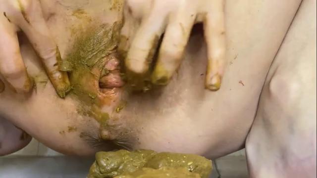 Подстелив на пол клеенку, женщина без трусиков присаживается на корточки и приступает срать. Выдавив из заднего прохода кучу теплого говна, дамочка рассматривает выделения, чмокает губами и облизывает губки. Разведя половые губы в стороны, развратница начинает запихивать дерьмо в розовую промежность.
